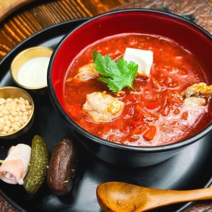 Классическая солянка с тремя видами копчёностей, с добавлением оливок, лимона и специй. Подаётся со сметаной и чесночной гренкой