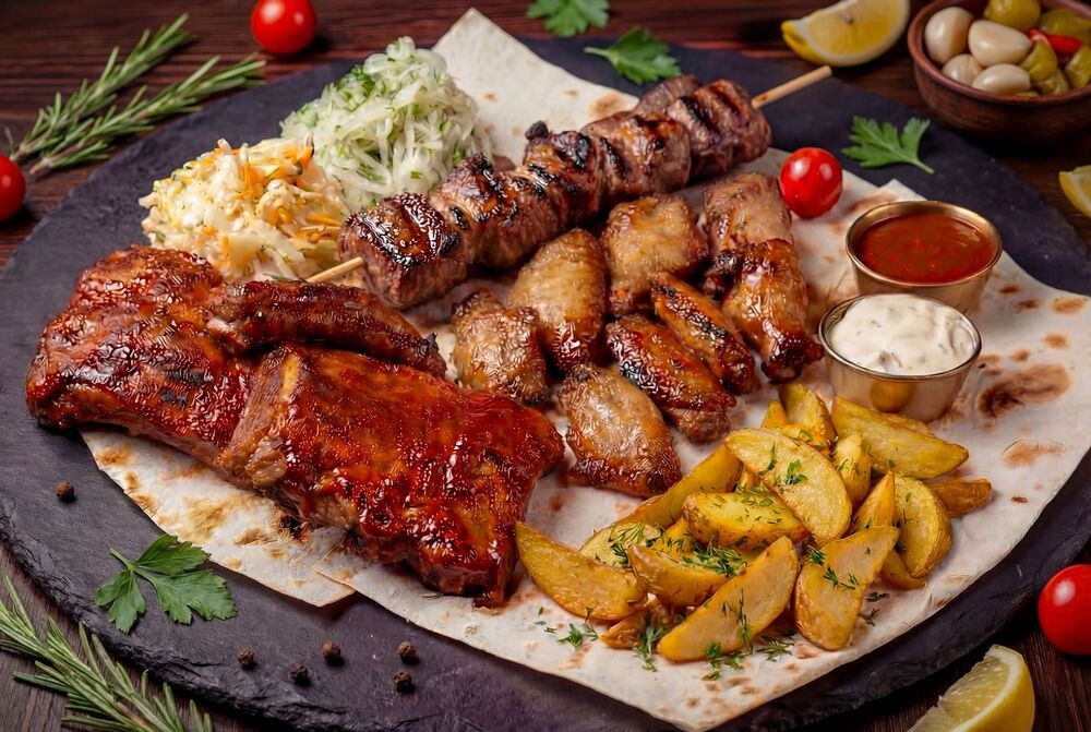 шашлык из свиной шеи-150г, свиные ребрышки-400г,крылышки-280г,картофель по-деревенски-150г,салат из капусты-100г,лук маринованный-100г,соус-150г, лаваш-100г