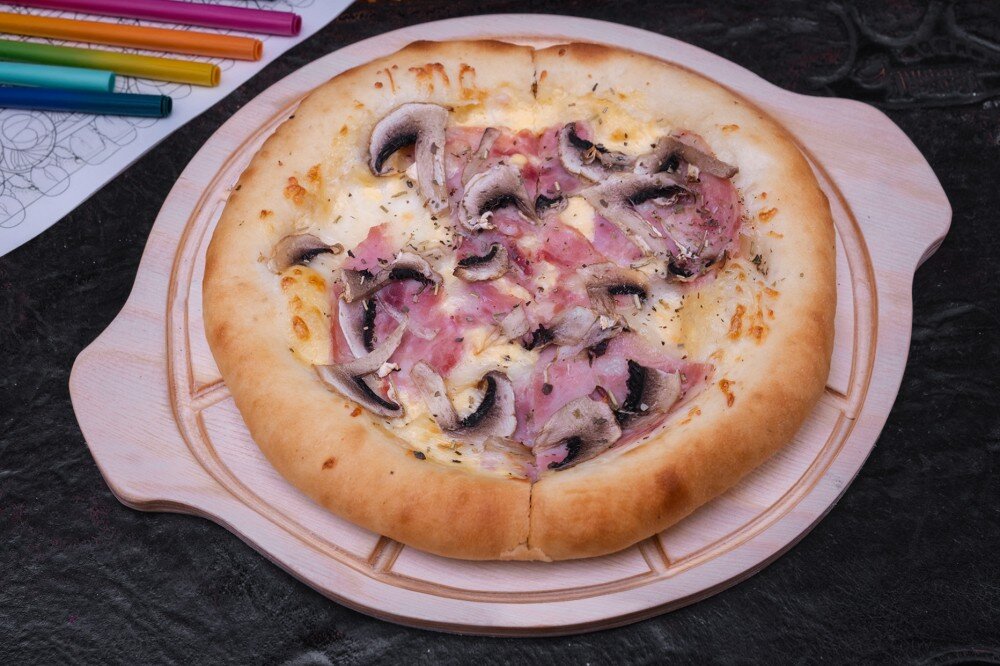 Пицца диаметром 20 см с ветчиной, грибами и соусом пицца в сочетании с сыром моцарелла