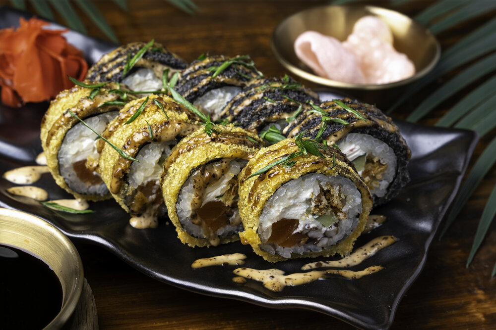 Осьминог, лосось, лук фри, огурец, крем-чиз, лук зелёный, ореховый соус, темпура-панировка,