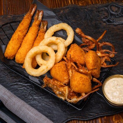 Луковые кольца обжаренные в кляре. Подаются с двумя видами соуса